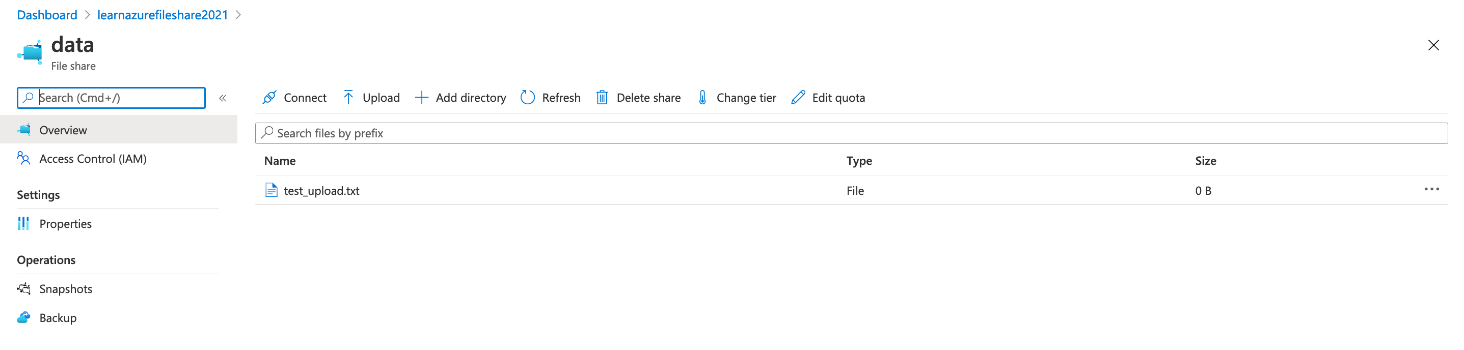 2. Azure Portal 로 다시 와서 data - File Share 로 들어오면 윈도우 가상머신에서 생성한 파일을 포털에서도 확인할 수 있다.