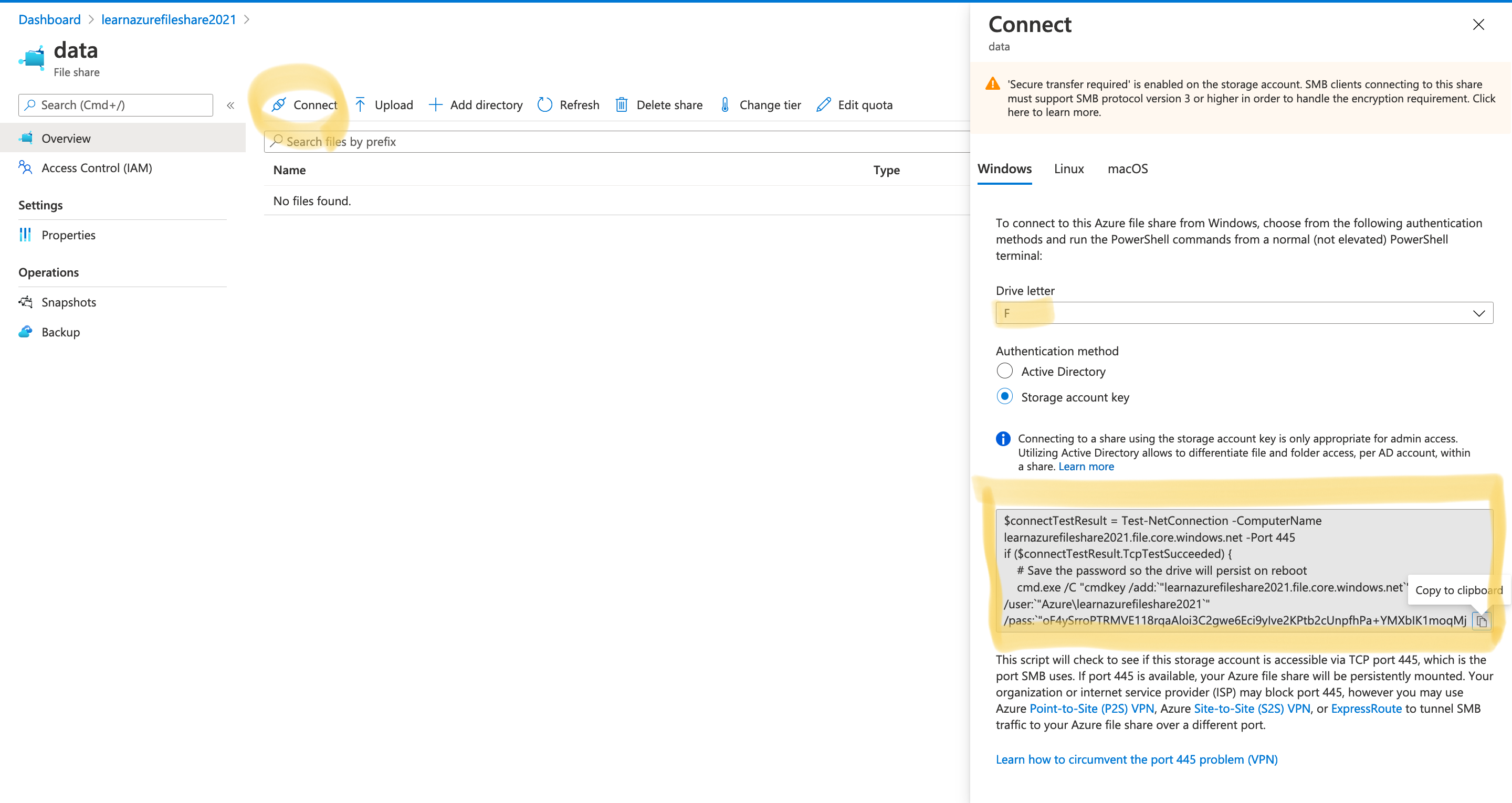1. Azure portal > Storage Acocunt > learnazurefileshare2021 계정에 들어간다.