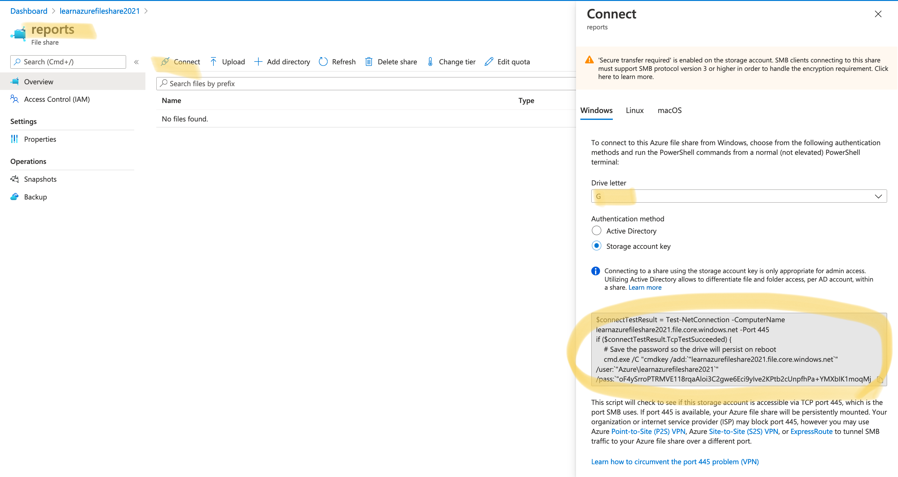 4. 다시 portal 로 와서 : Storage Acocunt > learnazurefileshare2021 계정에 들어간다.